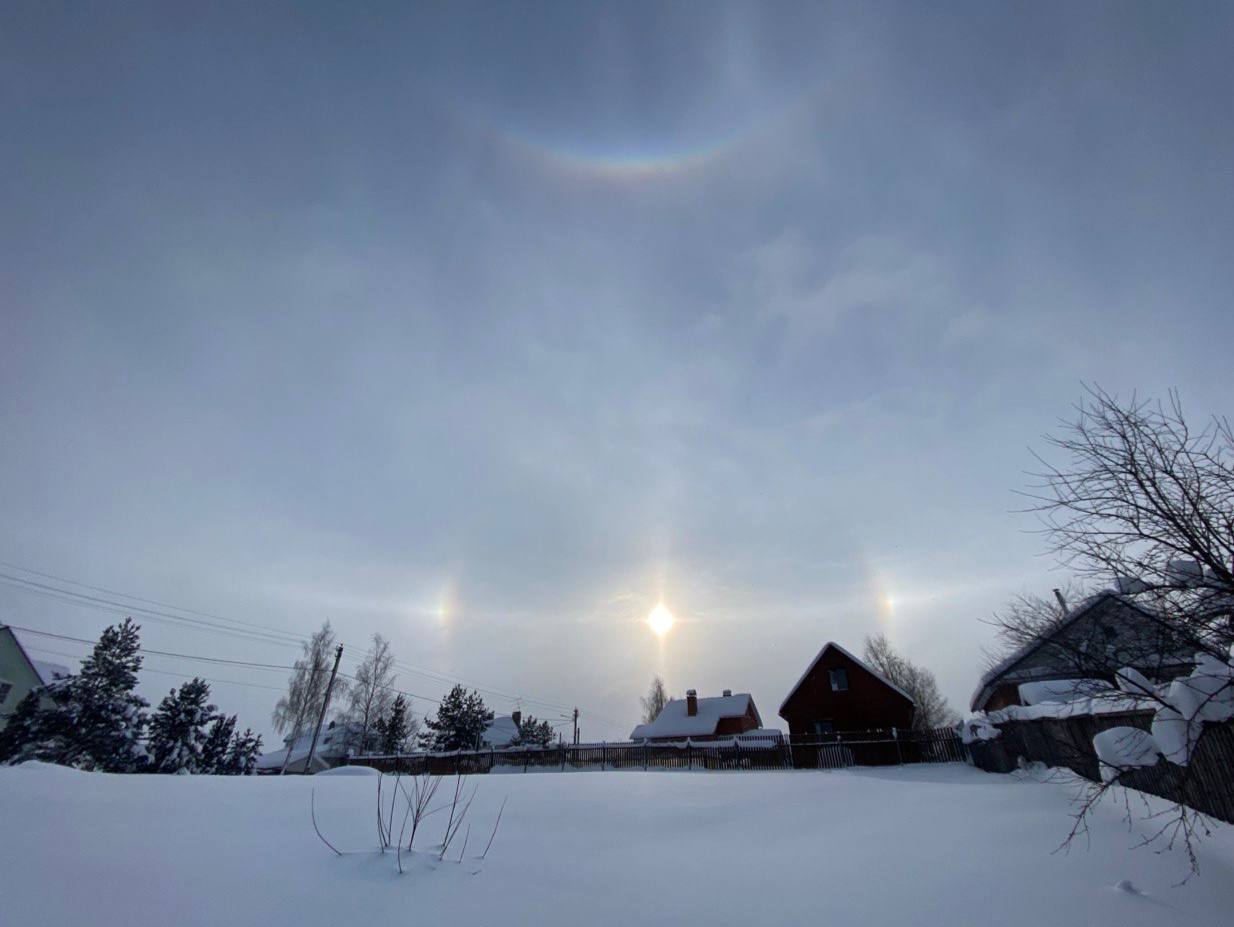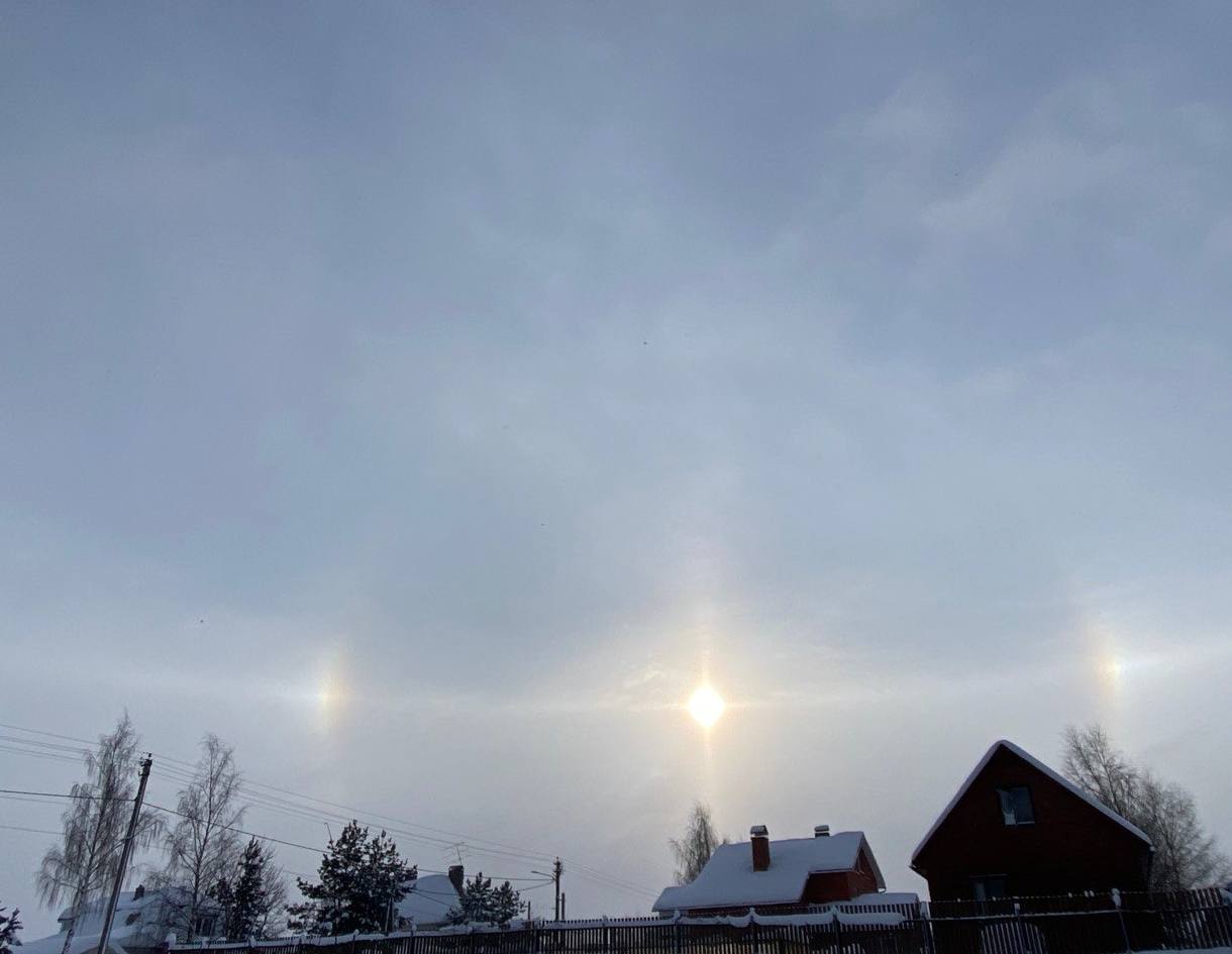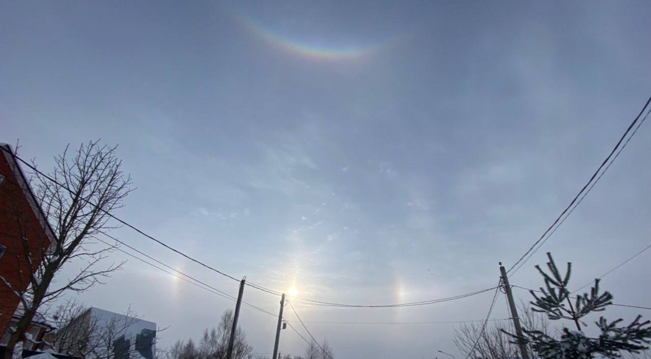 Паргелий в Подмосковье. Эффект «трёх солнц». А тут ещё и сверху дуга радужная