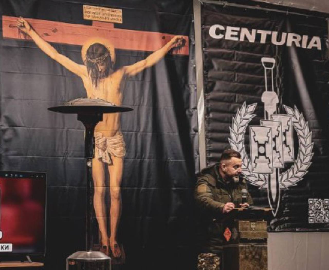 Рядом - плакат «Центурии» (новые оуновцы) с символами палачей Христа - венка, меча и трех щитов римских легионеров.
