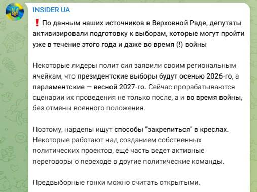 По данным украинского издания со ссылкой на источники в Раде, президентские выборы могут пройти осенью 2026 года, парламентские — весной 2027-го. Прорабатывают сценарии проведения даже при военном положении.