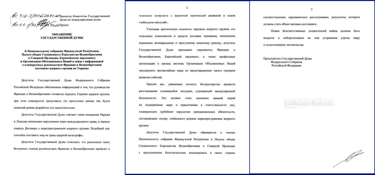 Авторы пишут о «критической опасности передачи ядерного оружия, его отдельных компонентов и средств доставки терпящему неминуемое поражение антинародному и преступному киевскому режиму» и призывают остановить такой сценарий.