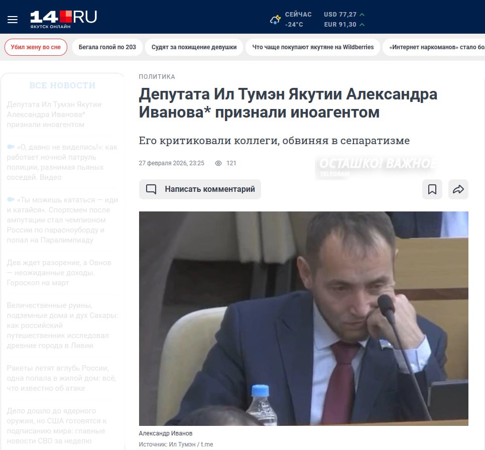 Минюст внёс в реестр иностранных агентов депутата заксобрания Республики Якутия Александра Иванова.
