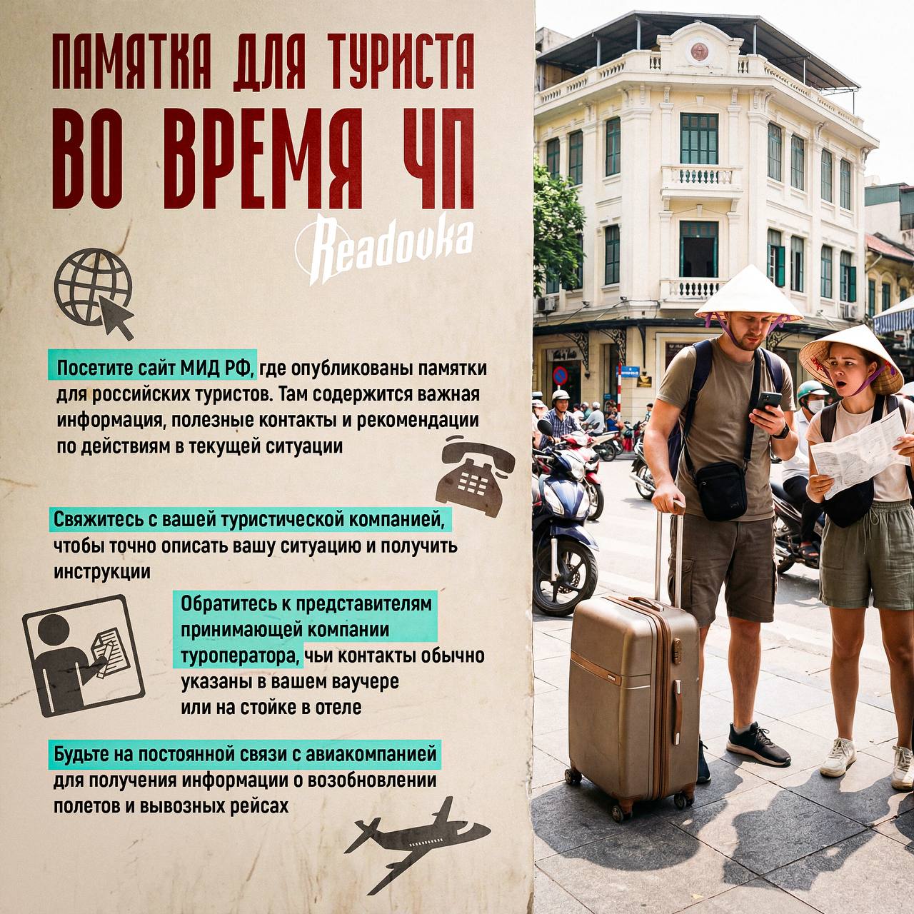 — Посетите сайт МИД РФ, где опубликованы памятки для российских туристов. Там содержится важная информация, полезные контакты и рекомендации по действиям в текущей ситуации;