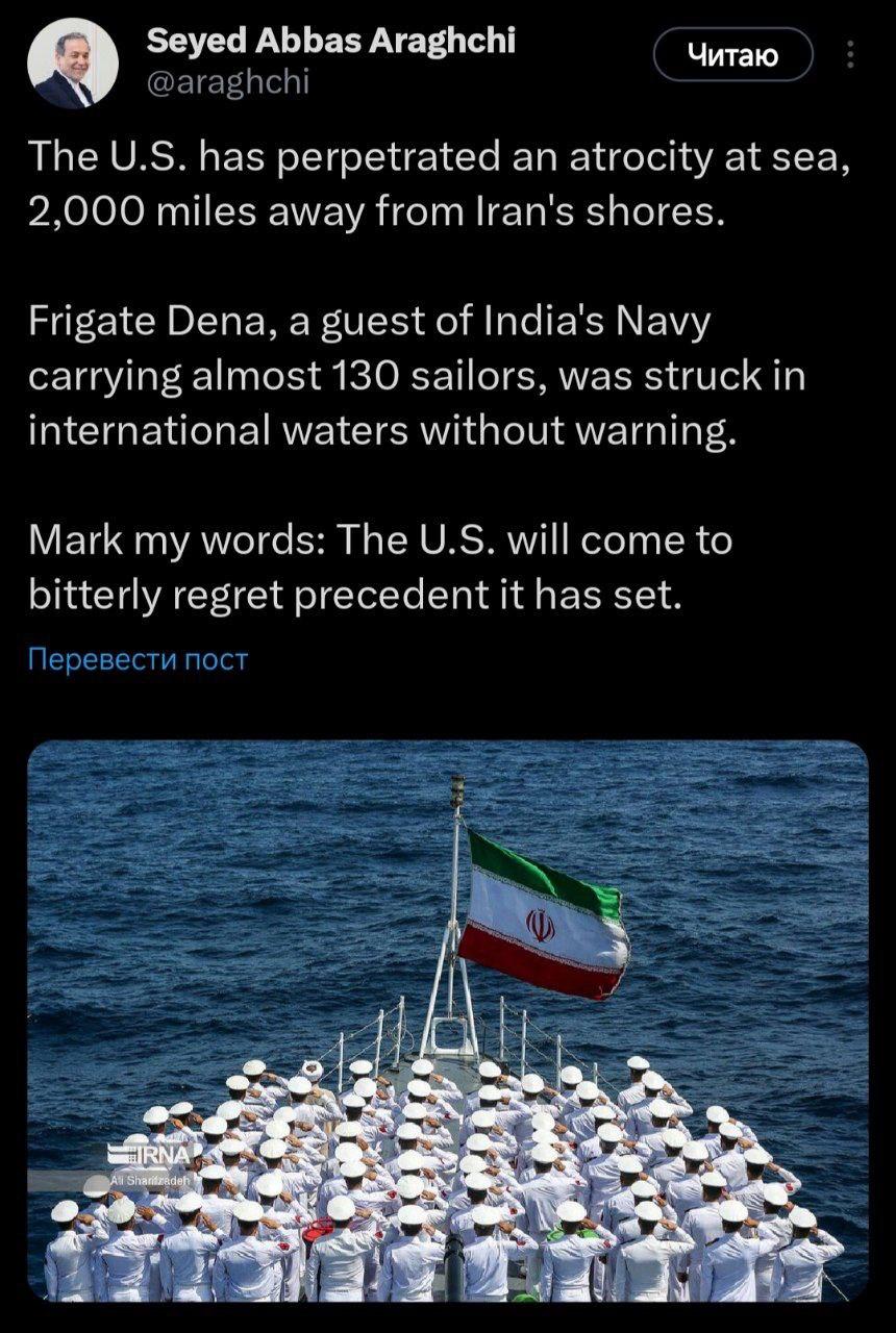 Глава МИД Ирана Аббас Аракчи выступил с резким осуждением действий Вашингтона после инцидента с иранским кораблем в международных водах. По словам министра, уничтожение судна, на борту которого находилось около 130 моряков, является актом морского зверства.