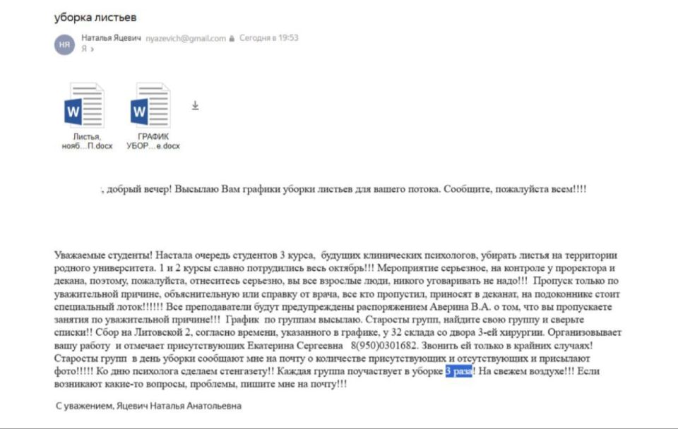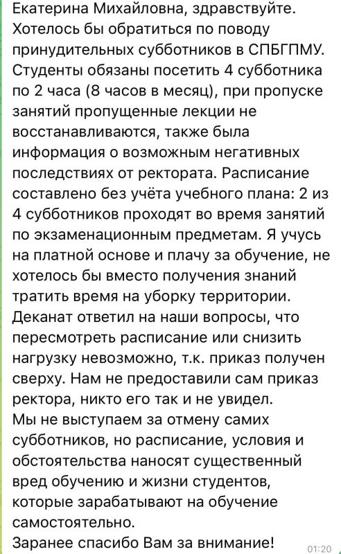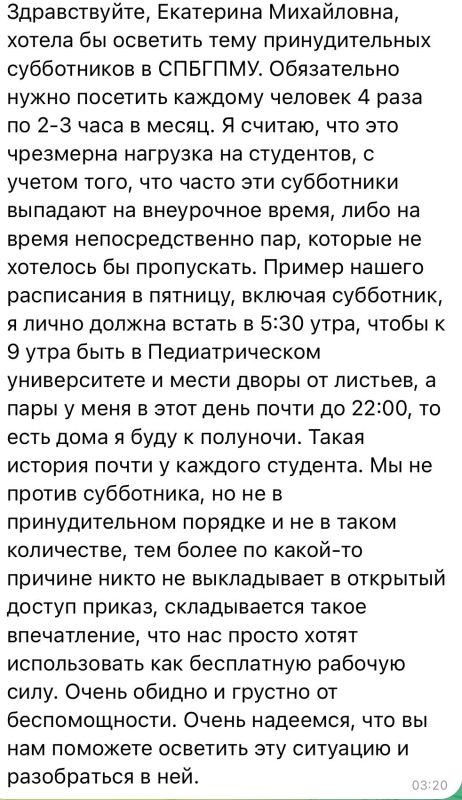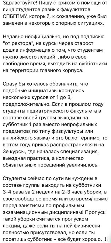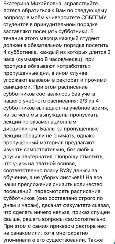 В СПБГПМУ опять скандал: ректорат никак не может справиться с листвой на территории, поэтому обязал студентов убираться. Как пояснили студентам - в «воспитательных целях». Каждый будущий педиатр обязан придти 4 раза и отработать по 2 часа, в том числе во время занятий и в выходные дни. Для этого студентам придется 2 недели пропускать лекции. За пропуски грозятся отчислить ребят, а приказ ректора по этой теме никто так им и не показал. По словам студентов, они не выступают против субботников как таковых, но не понимают, почему расписание составлено так, что это вредит учёбе.