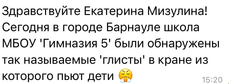 В гимназии номер 5 Барнаула есть краны, из которых школьники могут попить воду. И это вроде правильно, но на днях ребята увидели в этом кране червяка (или глиста) и прислали видео