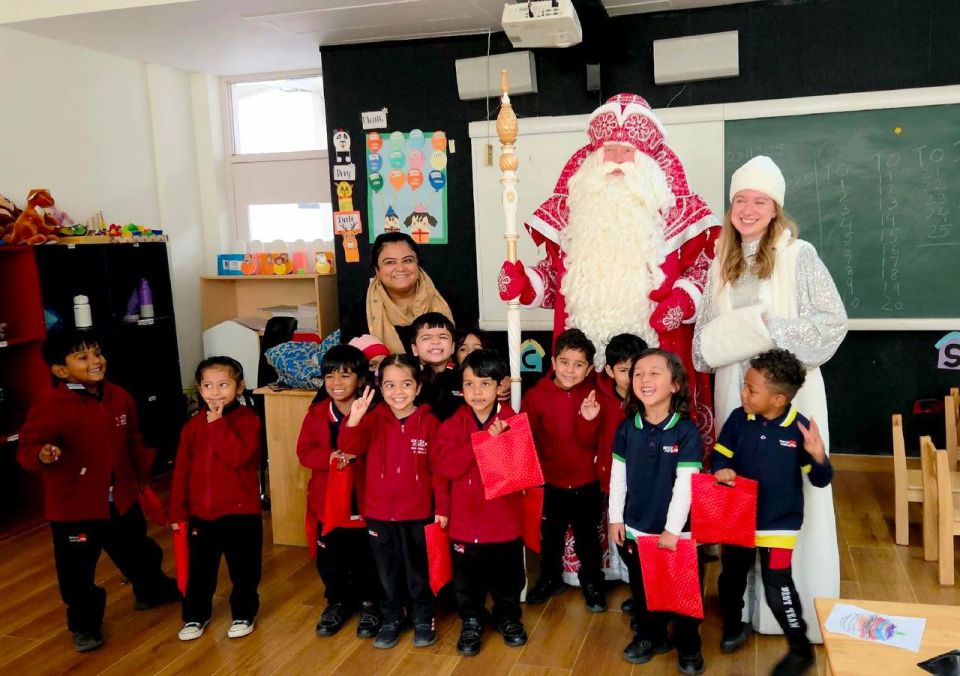 Русский Дед Мороз посетил международную школу "Санта Мария" и поздравил более 150 учеников младших классов. Дети с удивлением трогали бороду волшебника и даже выучили русские слова "Спасибо" и "С Новым годом".