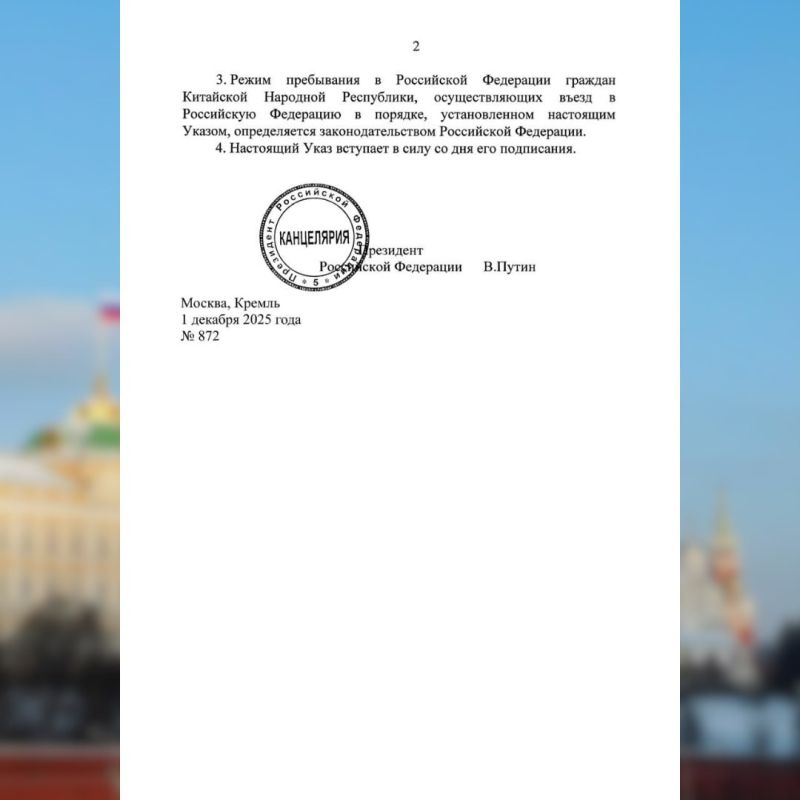 1 декабря Президент России В.В.Путин подписал Указ «О временном порядке въезда в Российскую Федерацию и выезда из Российской Федерации граждан Китайской Народной Республики.