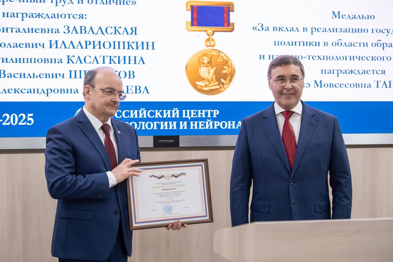 Валерий Фальков наградил почетной грамотой Минобрнауки коллектив РЦНН, вручив ее директору Центра вице-президенту Российской академии наук Михаилу Пирадову.