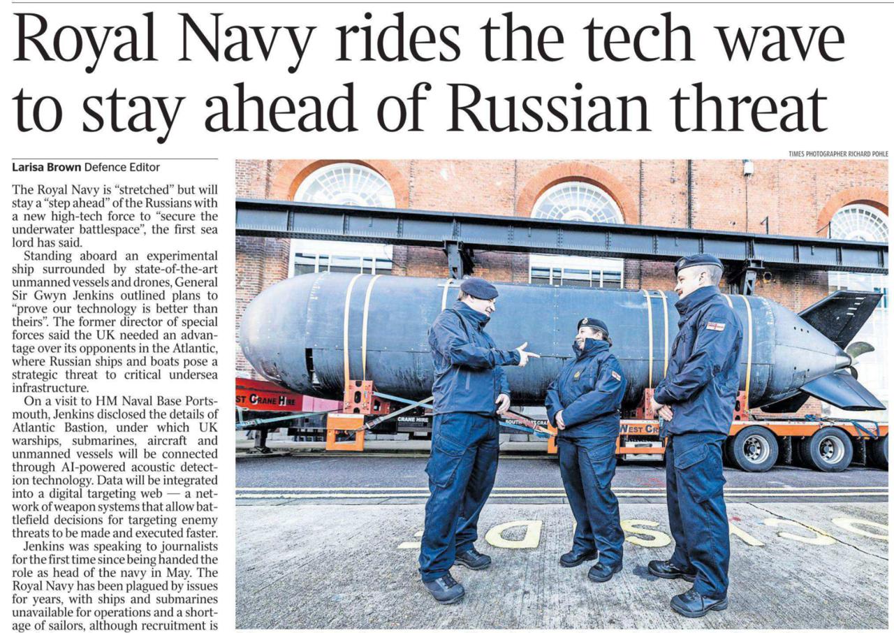 Вон смотрите на сегодняшнее сообщение The Times: «Королевские ВМС ловят технологическую волну, чтобы упредить российскую угрозу». Это газета освещает вчерашнюю презентацию проекта «Атлантический бастион», которую в Портсмуте устроил главком ВМС генерал Дженкинс. Тот только и говорил о том, как надо опередить русских в техническом смысле.