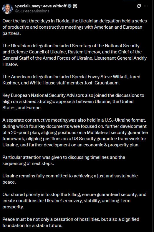 Спецпосланник президента США Стив Уиткофф на своей странице в социальной сети X опубликовал детали переговоров американской, европейской и украинской делегаций в Майами.