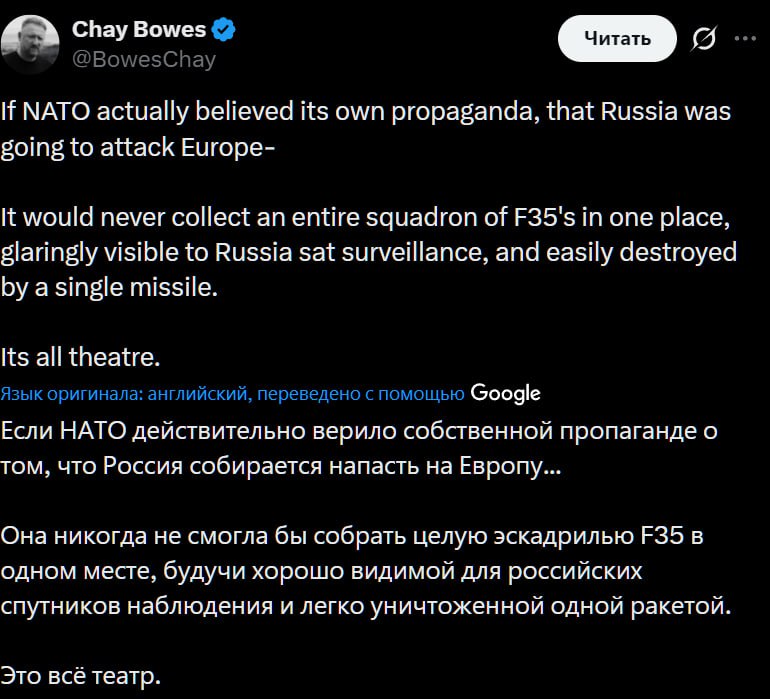«Если бы НАТО действительно верило собственной пропаганде о том, что Россия собирается атаковать Европу, оно бы никогда не собрало целую эскадрилью F35 в месте, легко уничтожаемом одной ракетой, тем более на виду у российских спутников»