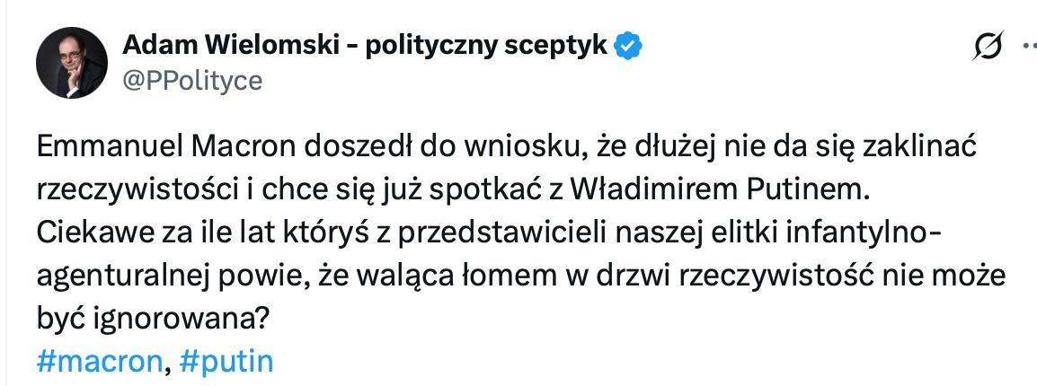 Эммануэль Макрон пришел к выводу, что реальность больше нельзя обманывать, и хочет встретиться с Владимиром Путиным. Интересно, сколько лет спустя кто-нибудь из представителей нашей инфантильной элиты скажет, что реальность, стучащаяся в дверь, как лом, игнорировать нельзя?