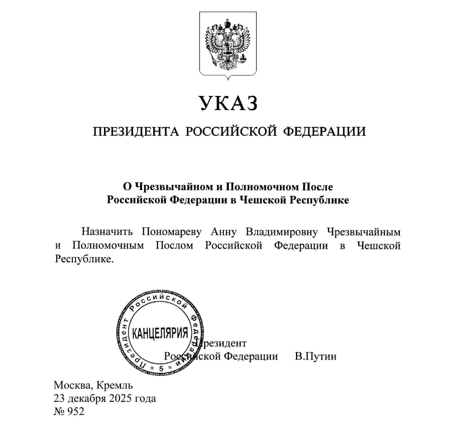 Указом Президента Российской Федерации № 952 от 23 декабря 2025 года Пономарева Анна Владимировна назначена Чрезвычайным и Полномочным Послом Российской Федерации в Чешской Республике.