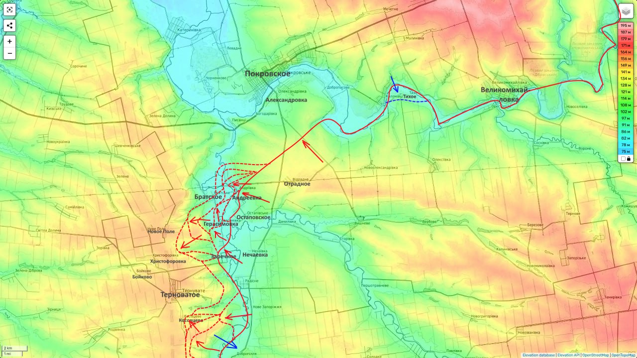 Которое таким образом уже охвачено с трех сторон. И противнику будет крайне трудно его в текущей ситуации удержать. А освобождение Терноватого будет обозначать прорыв оборону ВСУ на реке Ганчур на оперативную глубину. В который далее можно будет вводить войска и развивать его, заходя в тыл Ореховской группировке противника с северо-востока.
