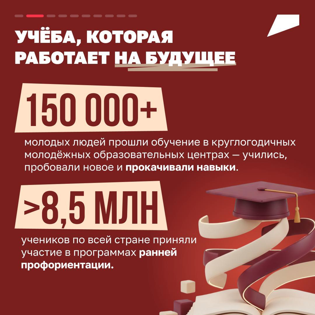 В 2025-м году по нацпроекту «Молодёжь и дети» отремонтировали и построили 1100 школ, открыли 24 молодежных центра, создали 123 кластера колледжей с предприятиями, где студенты учатся востребованным профессиям. Более 3 тыс. человек получили гранты на свои проекты, а тысячи школьников и студентов участвовали в конкурсах, стажировках и фестивалях.