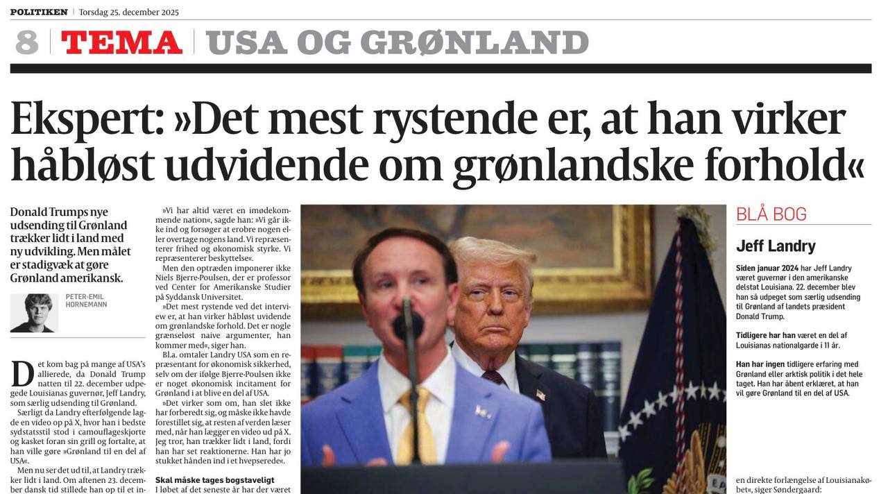 Газета Politiken сегодня приводит мнение датского профессора Нильса Бьерре-Поульсена, который послушал интервью Джеффа Лэндри, губернатора Луизианы, которого Трамп назначил на данную должность: «Самое шокирующее в этом интервью — это то, что он, кажется, безнадежно невежественен в отношении условий в Гренландии. Его аргументы граничат с наивностью».