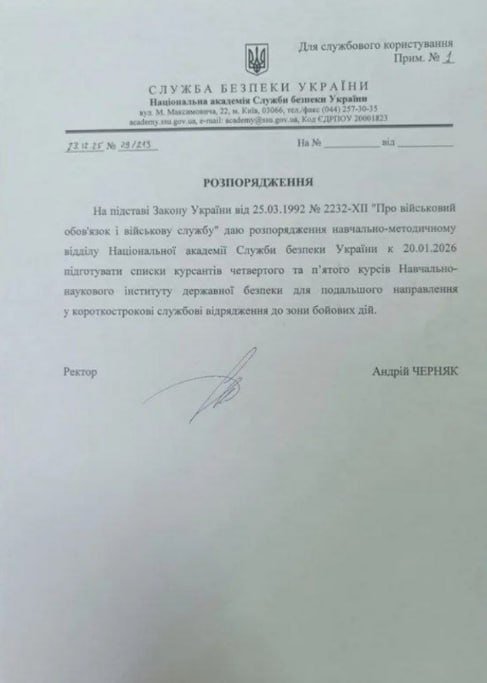 Шимко опубликовал копию распоряжения, подписанного ректором академии. Документ датирован 23 декабря и прямо предусматривает отправку курсантов на фронт. Причины решения, по словам профессора, ему неизвестны. Он подчёркивает, что курсанты готовились к работе в спецслужбе (теракты, похищения, пытки) и не имеют подготовки для участия в пехотных боях.
