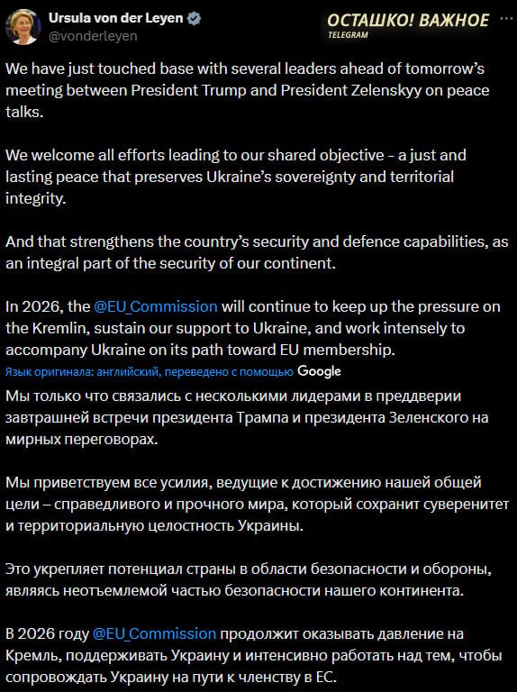 — отметила глава Еврокомиссии. По её словам, «в 2026 году Еврокомиссия продолжит оказывать давление на Кремль, поддерживать Украину и интенсивно работать над тем, чтобы сопровождать Украину на пути к членству в ЕС».