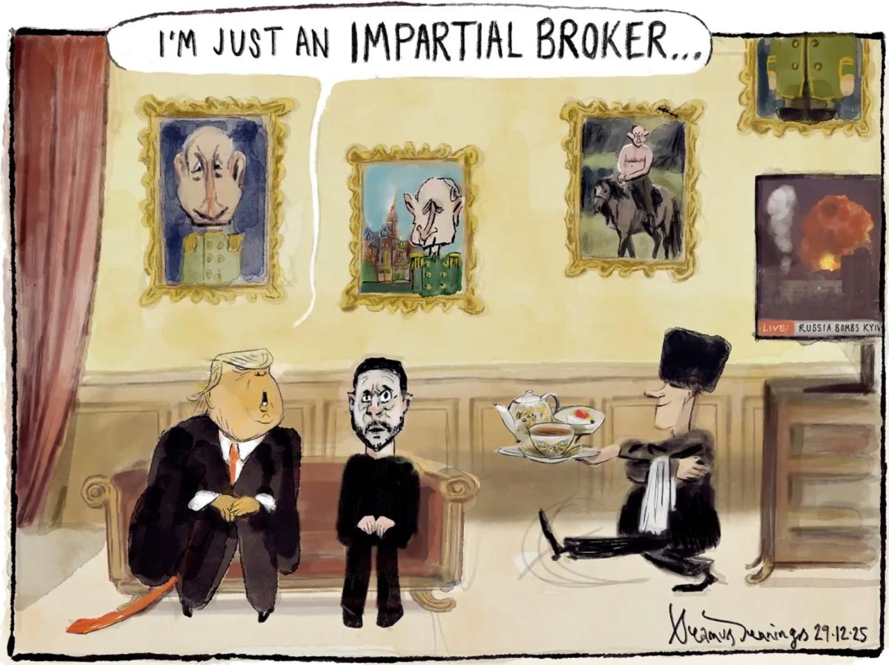 Встреча Трампа и Зеленского закончилась поздно, поэтому в европейскую прессу финальная пресс-конференция не попала. Но вот сегодняшняя The Times успела ее проиллюстрировать: «Я всего лишь беспристрастный брокер…»