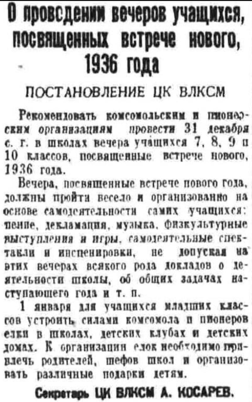 28 декабря 1935 г. вышла статья Постышева об организации новогодних елок. А уже 29-го было опубликовано постановление ЦК ВЛКСМ о срочном проведении таких мероприятий «силами комсомола и пионеров». Судя по скорости принятия решения, елки того года пришлось готовить впопыхах…