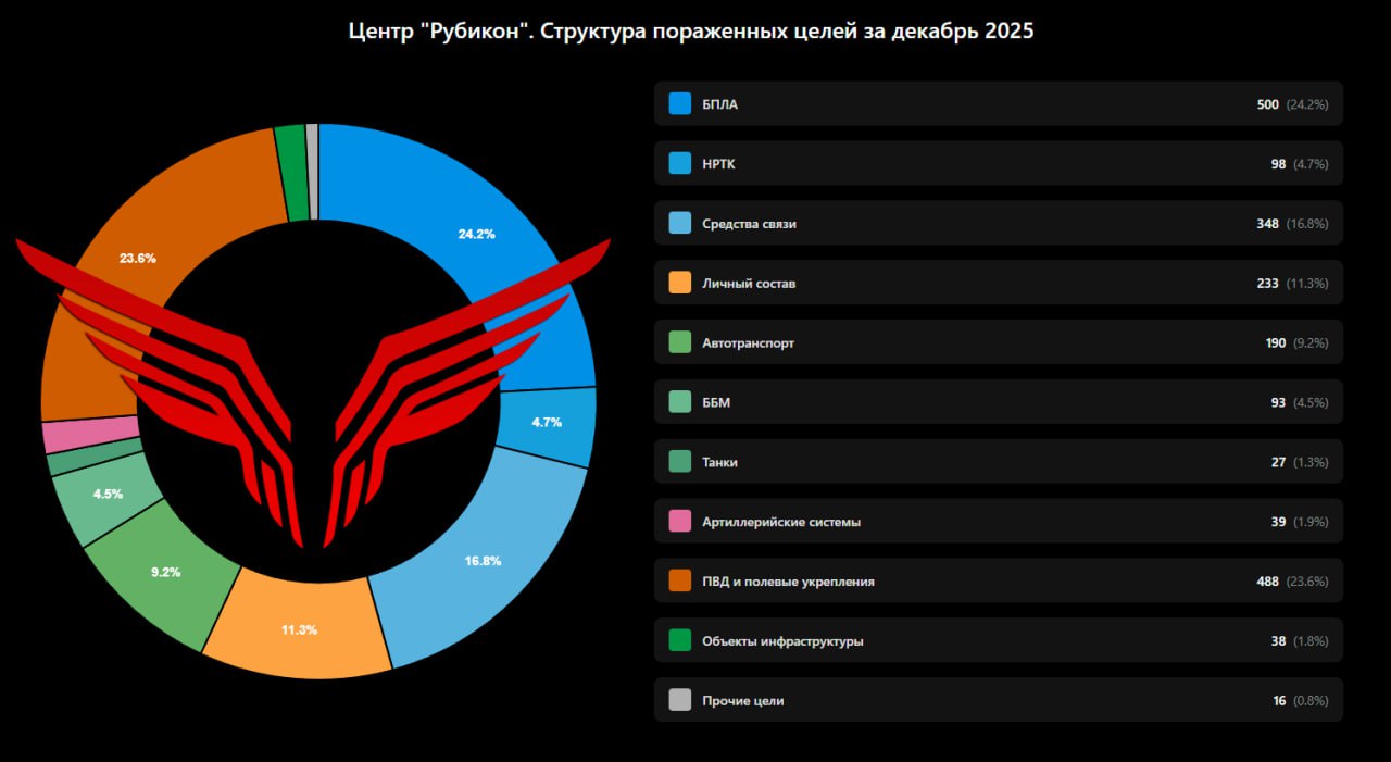 Количество опубликованных эпизодов поражения целей противника операторами Центра "Рубикон" в декабре 2025 составило2070, войдя в тройку лучших результатов в 2025 году, несмотря на сложные погодные условия на ЛБС в истекшем месяце.