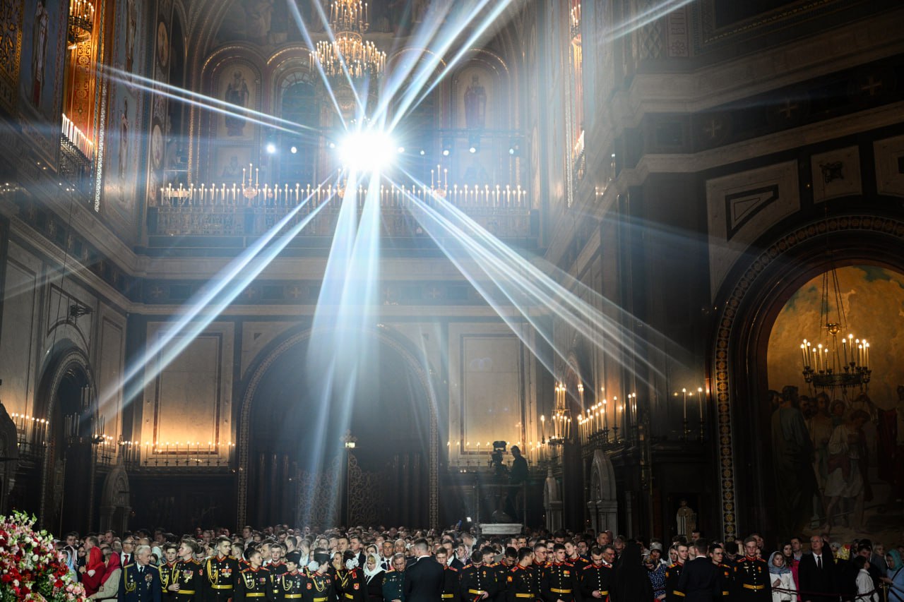 Верующие на праздничном Пасхальном богослужении в храме Христа Спасителя в Москве (Рамиль Ситдиков / РИА Новости)