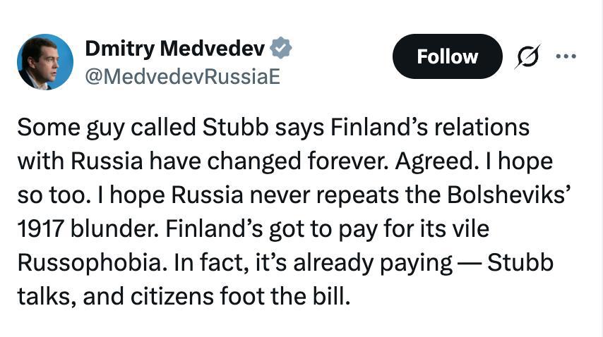«Какой-то парень по имени Стубб говорит, что отношения Финляндии и России изменились навсегда. Согласен. Я тоже на это надеюсь. Надеюсь, Россия никогда не повторит ошибку большевиков 1917 года. Финляндии придется заплатить за свою мерзкую русофобию. На самом деле она уже платит — Стубб говорит, а граждане платят».