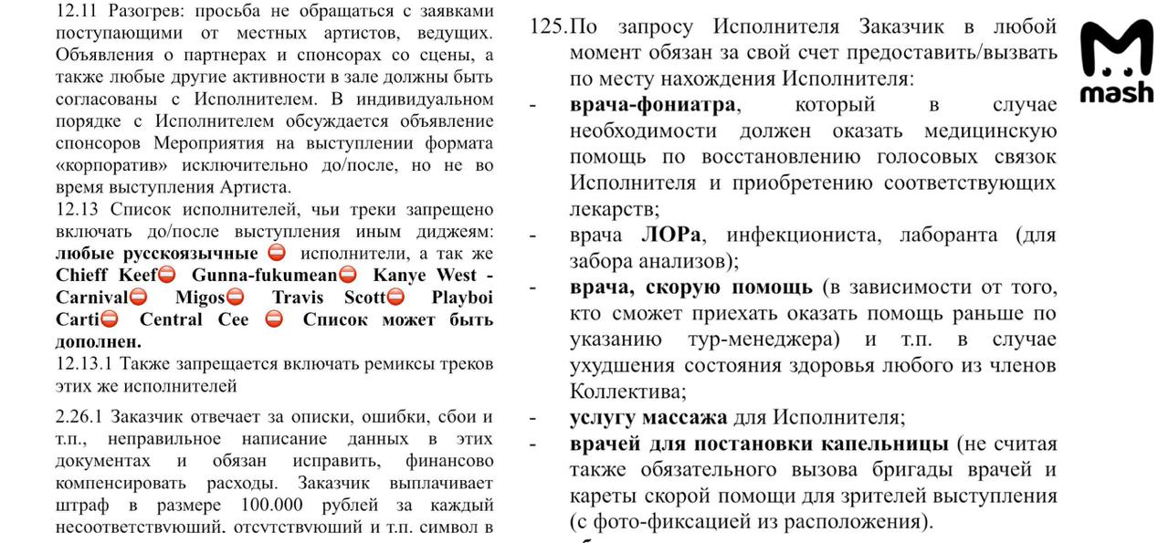 Самое интересное: Тейп присылает список, чьи треки запрещено включать диджеям до и после выступления хэдлайнера — любые русскоязычные, Chief Keef, Gunna (трек fukumean), Kanye West (трек Carnival), Migos, Travis Scott, Playboi Carti, Central Cee.