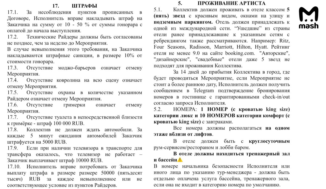 Штрафы команда исполнителя "Взял твою Бу и её е*у" распределила так: 10-минутная заминка сценических помощников — 100к рублей, отсутствие туалета рядом с гримеркой — 100к, ожидание автомобиля — 10к за каждые 10 минут, неработающий телевизор в авто — 10к.