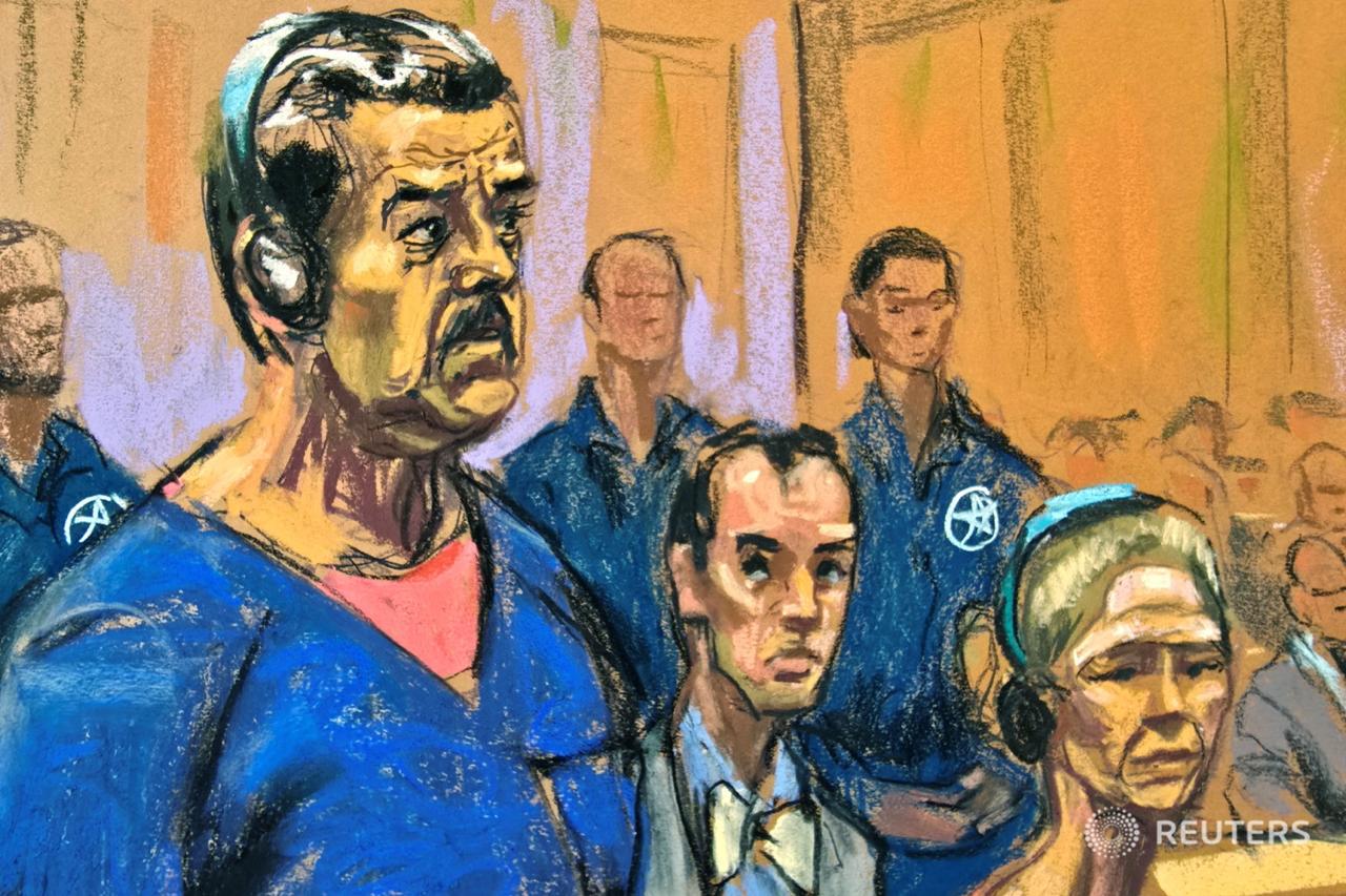 Reuters опубликовал художественные зарисовки из зала суда в Нью-Йорке, перед которым предстали Мадуро и его жена Флорес.