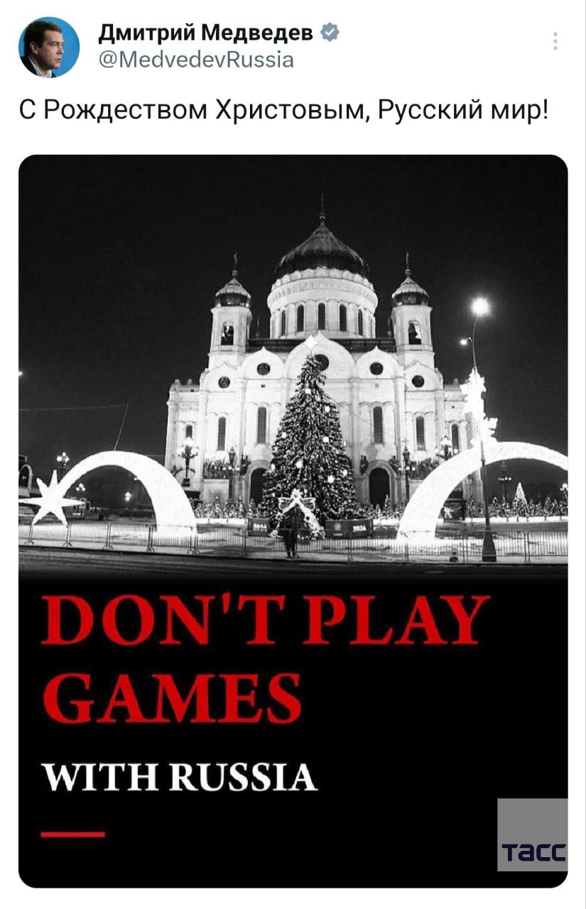 Медведев разместил в X открытку с Храмом Христа Спасителя и надписью на английском языке "Не играйте в игры с Россией".
