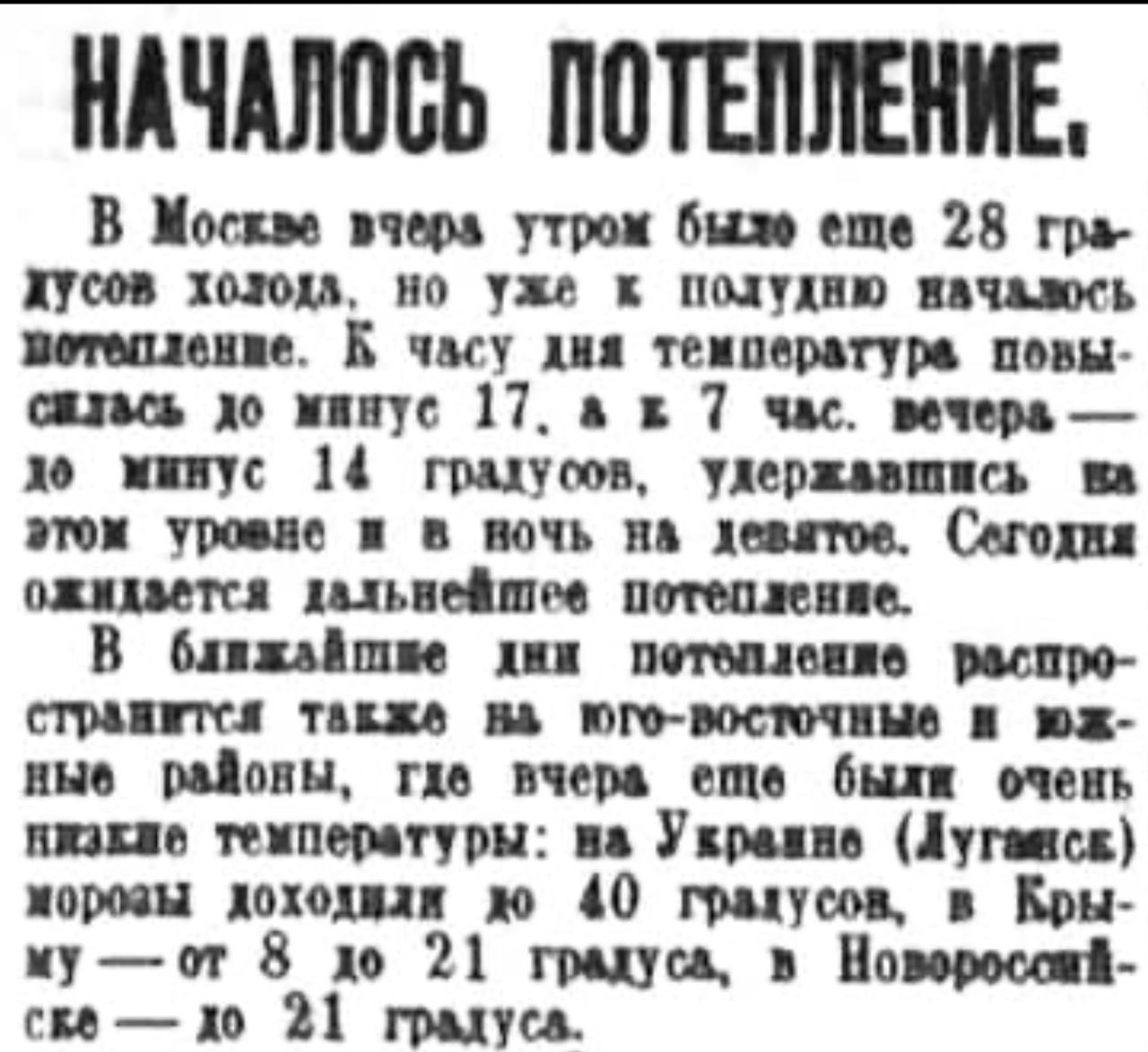 А вот в эти же дни 90 лет назад (соответственно, в 1935 году) сообщалось, что в Москве ожидается резкое потепление до минус 14-17 градусов!