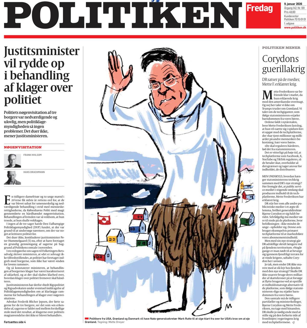 Датская пресса дружно обрушилась на генсека НАТО Марка Рютте, который воды в рот набрал по поводу наезда Трампа на Гренландию. Вот как рисует его сегодня газета Politiken.
