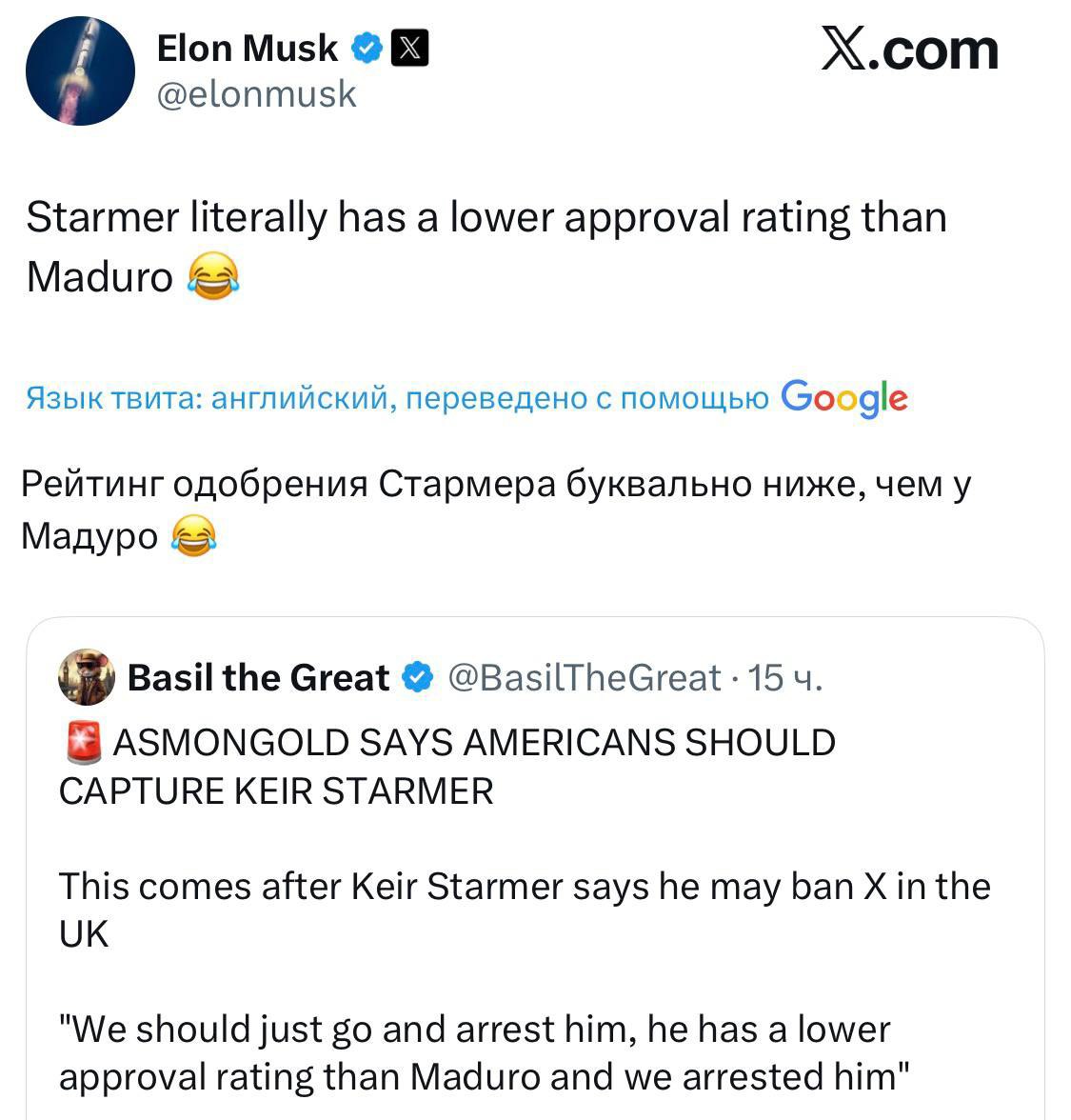 Рейтинг одобрения Стармера в Британии ниже, чем рейтинг Мадуро в Венесуэле, заявил Илон Маск, комментируя предложение пользователей соцсетей выкрасть британского премьер-министра.