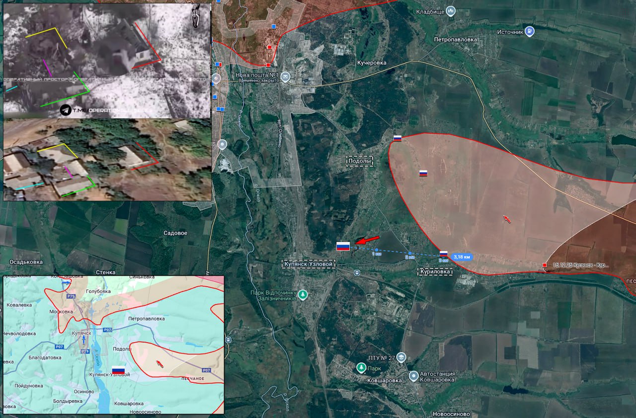 Военнослужащие ВС РФ поднимают флаг Российской Федерации в жилой застройке в западной части Куриловки.