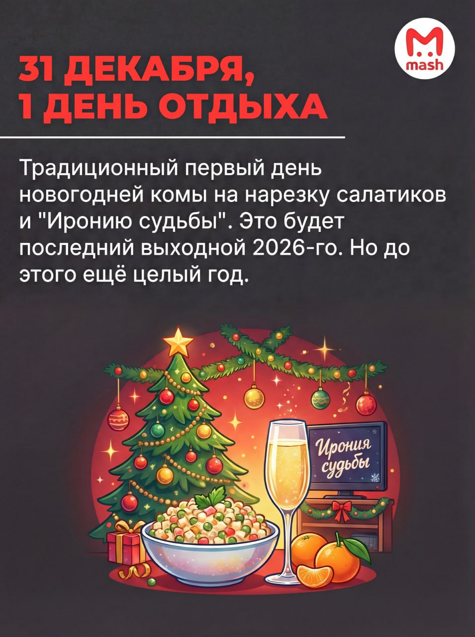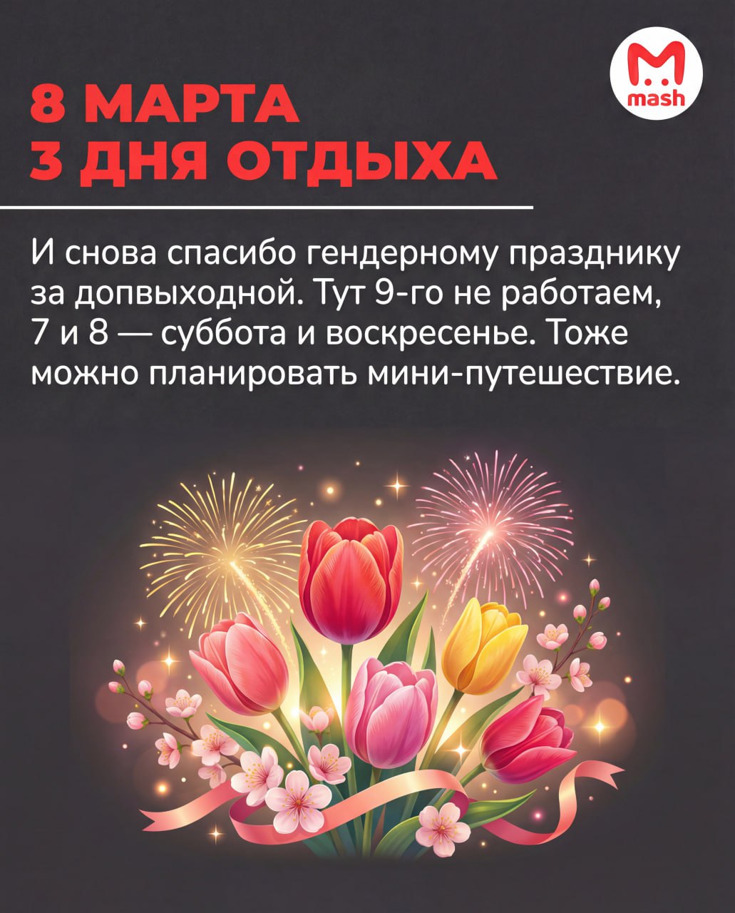 Неприлично длинные выходные почти кончились — пора возвращаться из салатно-игристо-лежательной комы. Грустно, неприятно, лениво, но не расстраивайтесь — впереди ещё много праздников, выходных и поводов кайфануть. Собрали для вас карточки, когда и сколько отдыхаем.