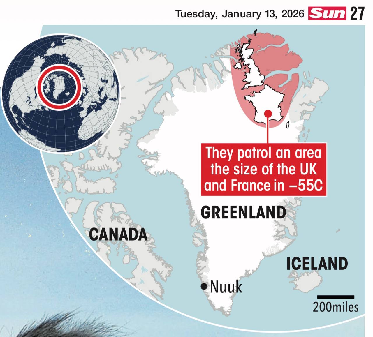 Кстати, к вопросу, поднятому Гидеоном Рахманом сегодня в FT (о том, что Трамп исключительно из-за проекции Меркатора переоценивает размер островка Греналандия). Забавно, что именно сегодня газета The Sun накладывает очертания Франции и Британии на Гренландию, указывая на то, что собачьи упряжки «патрулируют территорию размером с Британию и Францию при минус 55 градусах».