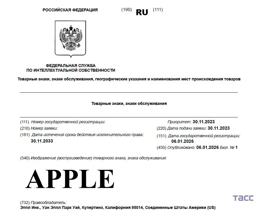 Корпорация Apple в начале 2026 года зарегистрировала в России одноименный товарный знак, выяснил корреспондент ТАСС.