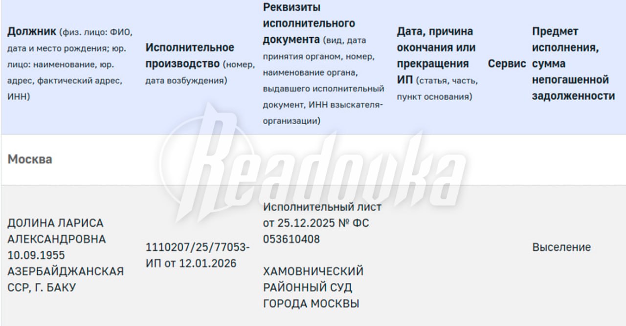 В базе данных ФССП появилось дело Ларисы Долиной. Судебное производство возбудили 12 января, а приставы основываются на исполнительном листе, выданном Хамовническим районным судом. Теперь, если певица не покинет квартиру самостоятельно, ее выселением займутся приставы.