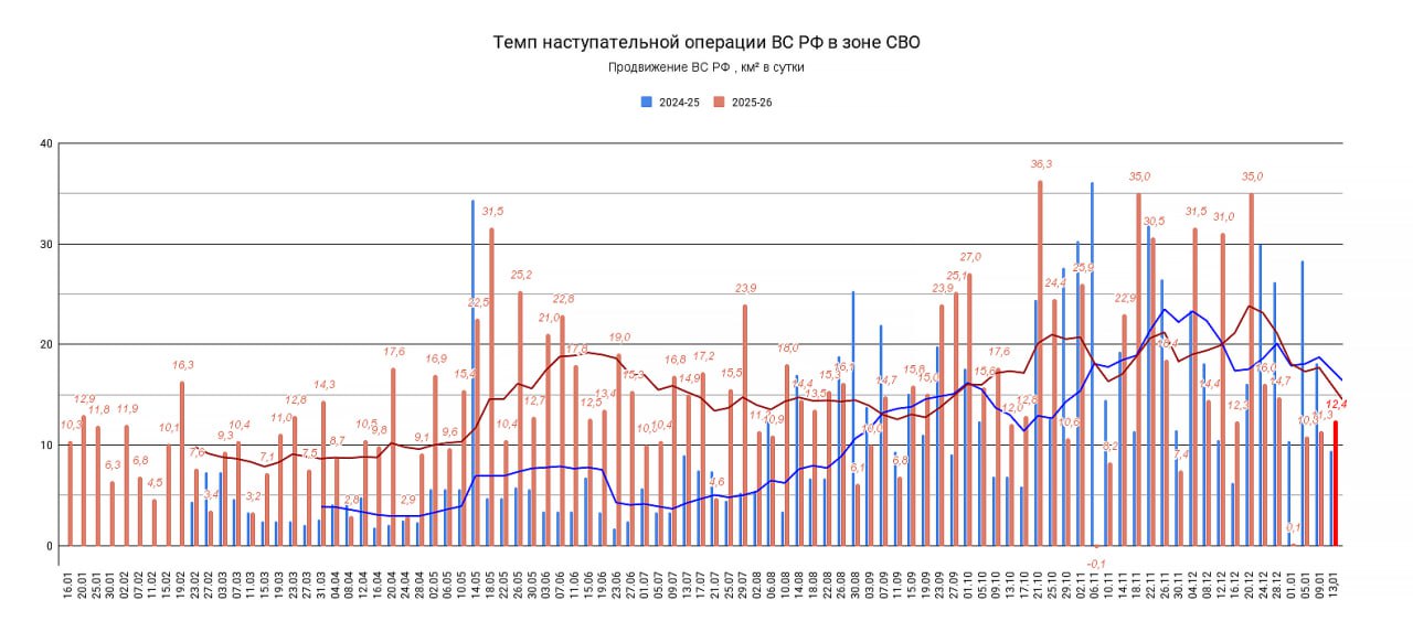 Обновление по данным c 09 по 12 января 2026. Темп продвижения +12,4 км в сутки за период, общее продвижение 49,3 км.