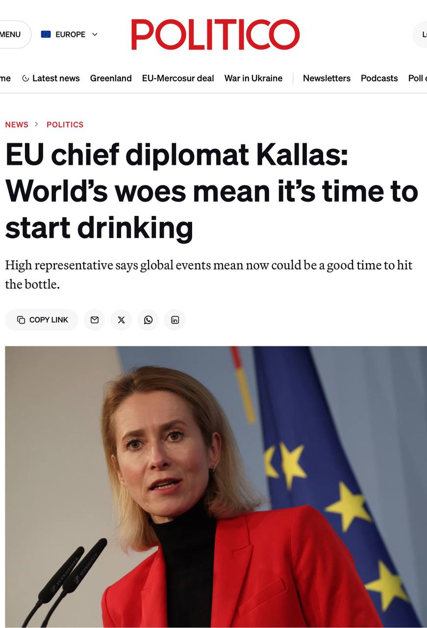 Кая Каллас заявила: состояние мировой политики сейчас таково, что сейчас «хорошее время», чтобы начать пить! Это она заявила на закрытой встрече с лидерами политических групп Европарламента, добавив, что сама она якобы «не большой любитель выпить».