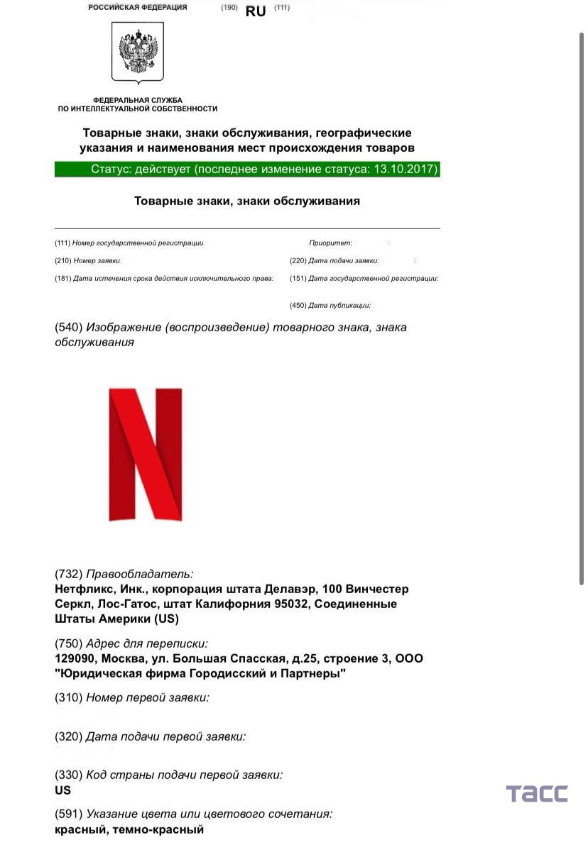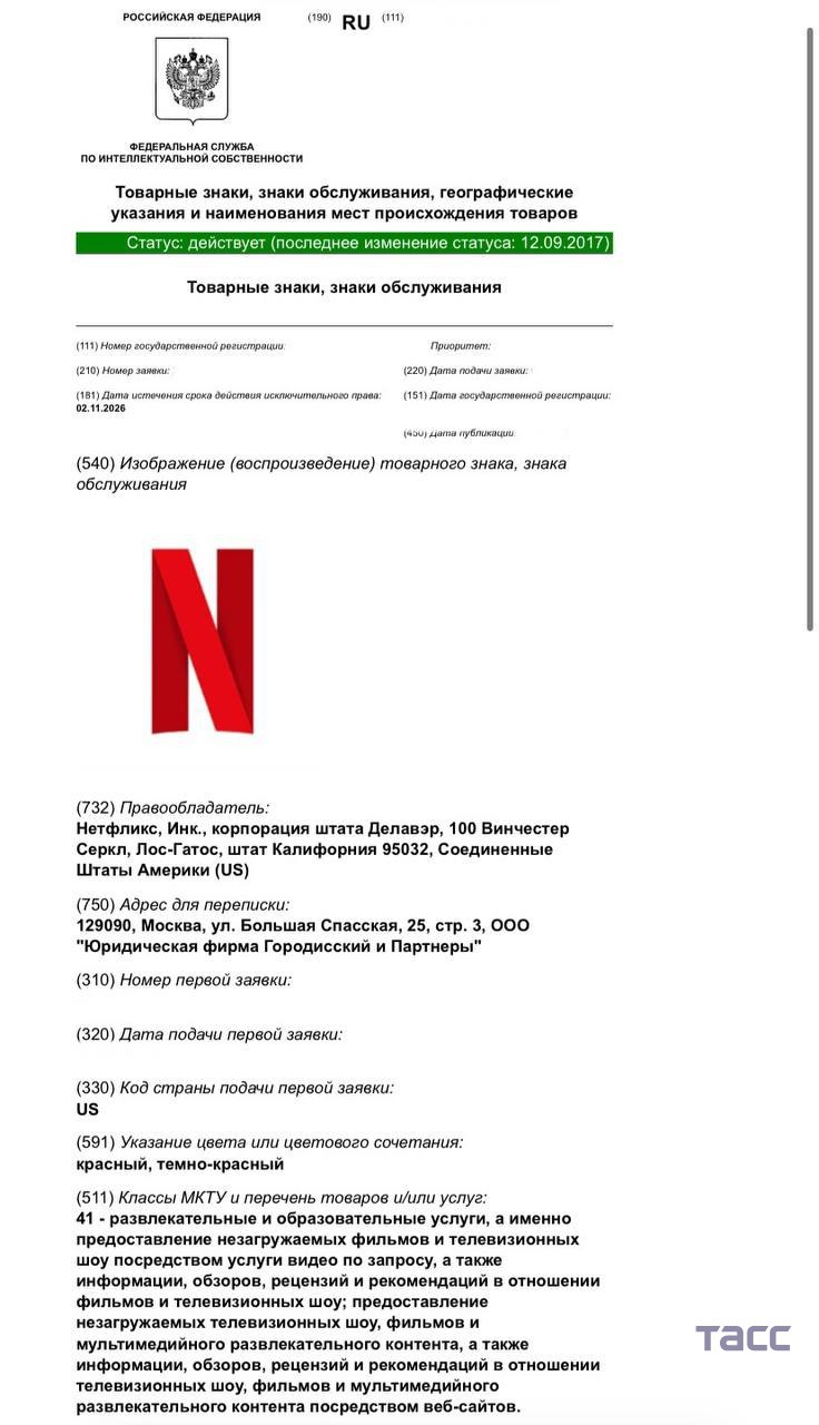 Стриминговый сервис Netflix продлил права на три товарных знака до 2036 года, выяснил корреспондент ТАСС.