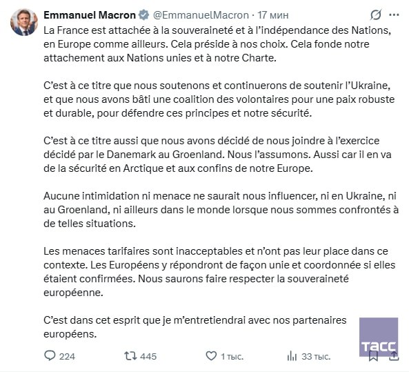 Макрон пообещал скоординированный ответ Европы на решение США ввести пошлины из-за ситуации вокруг Гренландии. Об этом он сообщил в соцсети X.