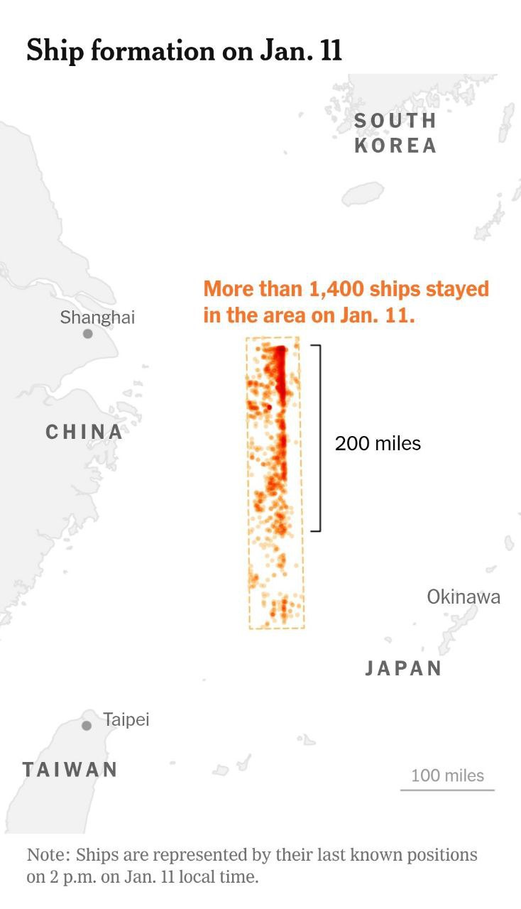 11 января в этом районе фиксировалась активная деятельность, ставшая продолжением предыдущей операции в конце декабря. Тогда, 25 декабря, около 2000 китайских рыболовных судов выстроились в боевой порядок, представлявший два параллельных строя протяжённостью до 290 миль, образовав характерную перевёрнутую «L»-образную конфигурацию. Как утверждается, подобные построения не имеют ничего общего с промысловой деятельностью.