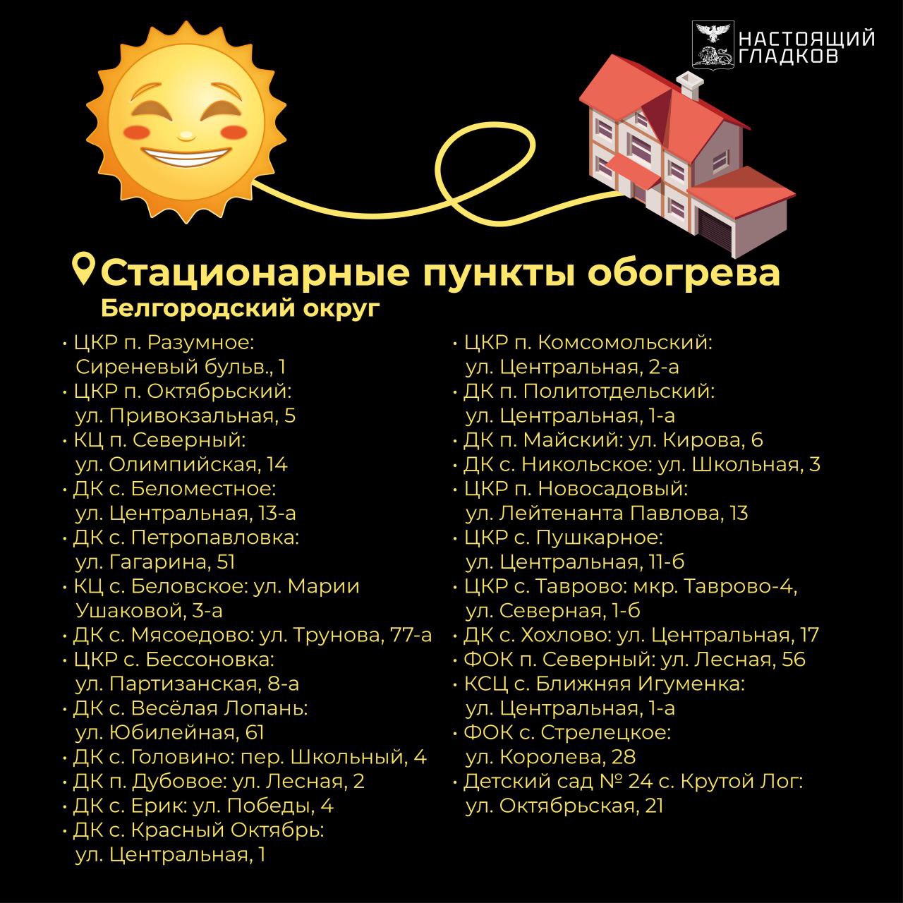 Дорогие друзья, размещаю адреса пунктов временного обогрева в Белгородском округе, которые развернем при возможной потере энергии.