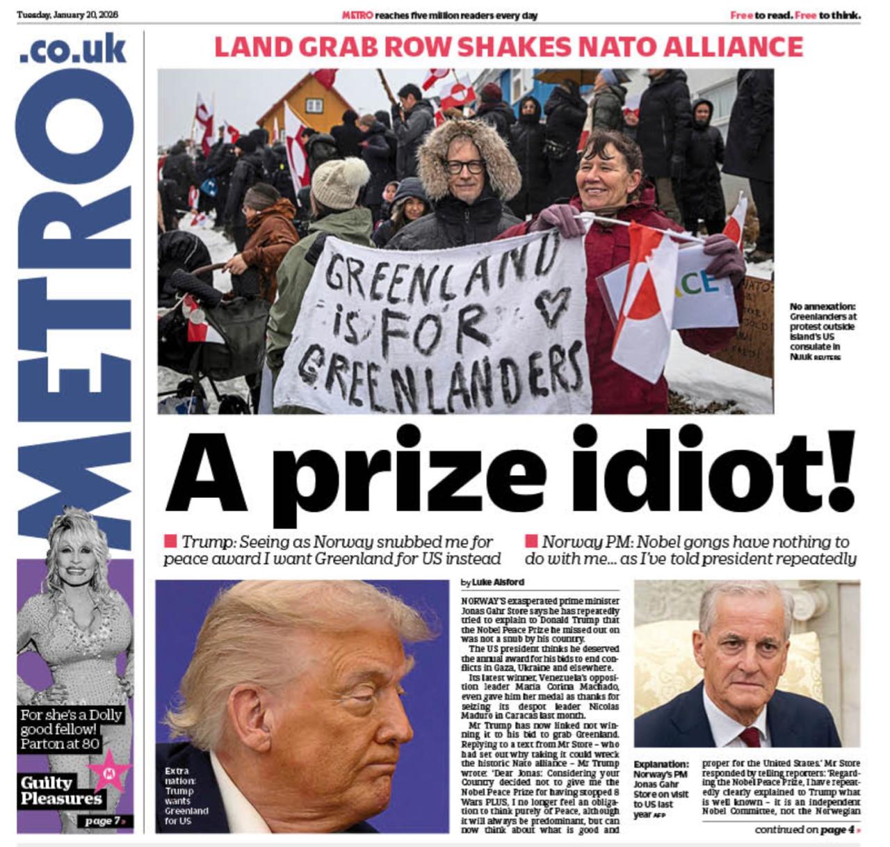«Призовой идиот!» Британская газета Metro приводит оправдания премьера Норвегии Йонаса Стёре перед Трампом. Норвежец безуспешно объясняет американцу, что его правительство не имеет никакого отношения к решениям Нобелевского комитета.
