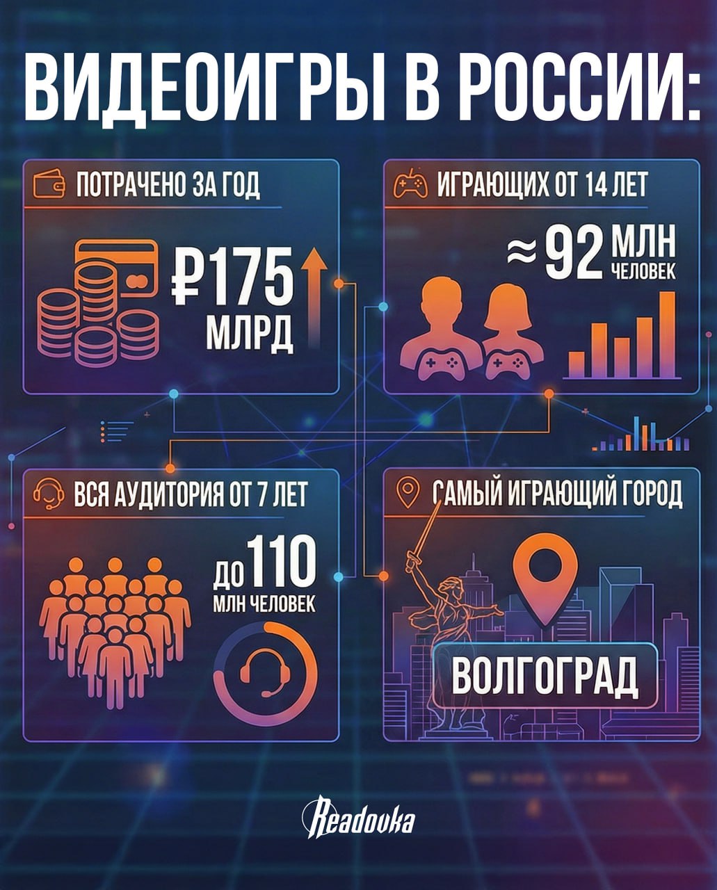 Играют в видеоигры 75% россиян 14 лет и старше — это около 92 млн. 24% жителей нашей страны играют раз в неделю или пару раз в месяц, а каждый пятый (18%) — пару раз в полгода или реже. Вся аудитория видеоигр составляет до 110 млн человек от 7 лет и старше — это 81% от численности населения РФ, согласно исследованию РВИ и НАФИ, с которым ознакомилась Readovka. За последние 3 года доля совершеннолетних играющих ежедневно, увеличилась на 11%. Гейминг занимает 4-е место по популярности среди досуга в нашей стране, уступая социальным сетям, просмотру ТВ, фильмов и сериалов дома и прослушиванию музыки.