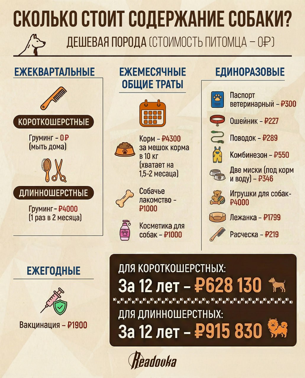Содержание любой собаки встанет в копеечку семейного бюджета. Основными расходами на четвероного друга считаются корм, груминг, косметика. Существуют и сезонные траты: одежда, ветеринария, противоклещевые препараты. Чтобы содержать дорогую породу собак (стоимостью 100 тыс), придется тратить 265 тыс в год. Бюджетные же породы (до 5 тыс) обойдутся примерно 76 тыс в год. За среднюю жизнь собаки в 12 лет элитная порода обойдется хозяину в 3,17 млн, тогда как бюджетная порода — 900 тыс. Почему столько получилось, смотрите в нашей карточке.