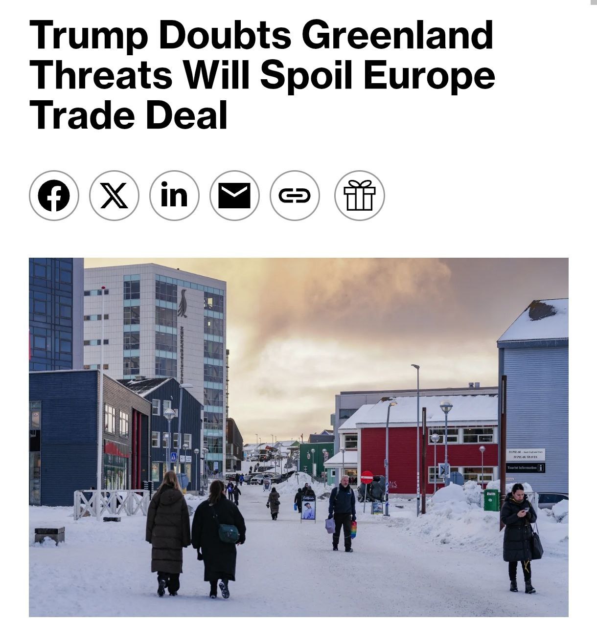 Некоторые европейские лидеры могут согласиться отдать Гренландию США, чтобы «угодить» Трампу, пишет Bloomberg со ссылкой на высокопоставленного европейского чиновника, участвующего в экономическом форуме в Давосе.