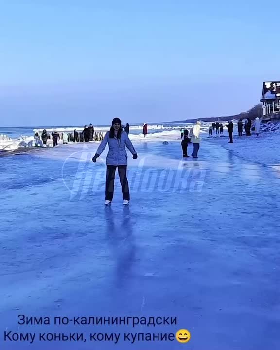 На набережной Калининграда, возле Балтийского моря, люди делятся на два лагеря: одни — в коньках и теплых вещах, другие — в плавках, будто лето. Девушка спокойно крутила пируэты на морском льду, как вдруг из ниоткуда появился мужчина в одних плавках, шлепках и с полотенцем.